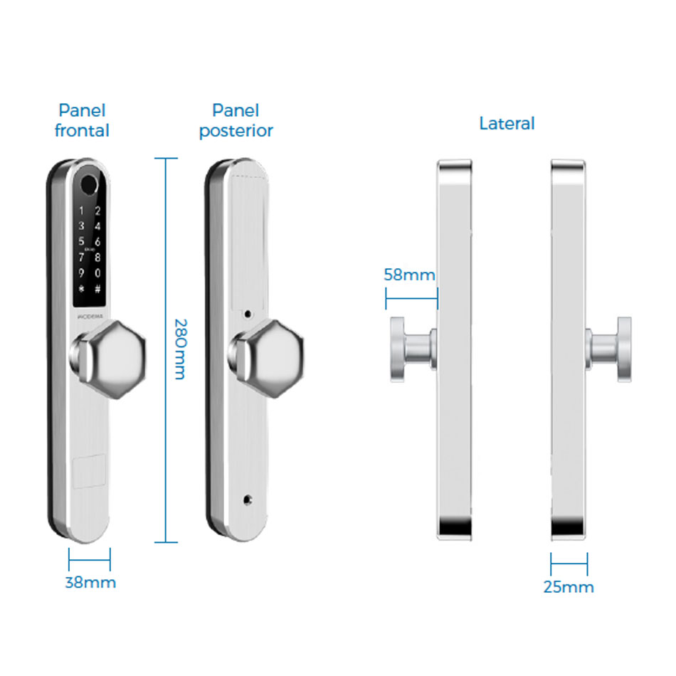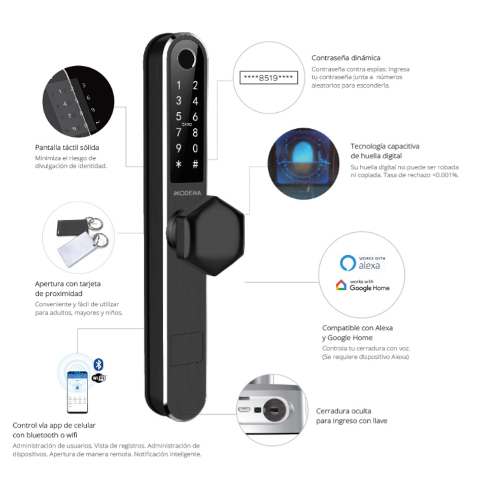 Tipos de Acceso: Lector biométrico, Clave cifrada, Llave de seguridad, Tarjeta de aproximación y APP con bluetooth y WiFi.