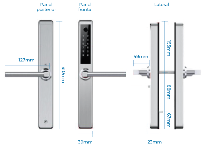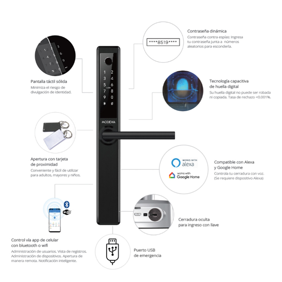 Tipos de Acceso: Lector biométrico, Clave cifrada, Llave de seguridad, Puerto USB de emergencia, Tarjeta de aproximación y APP con bluetooth y WiFi.